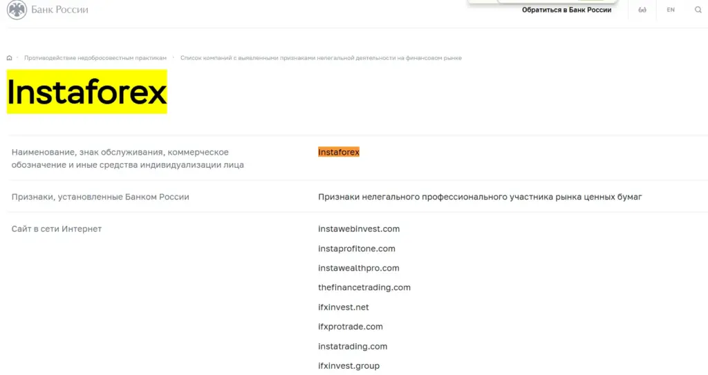 Instaforex обзор. Черный список ЦБ РФ: Официальное предупреждение